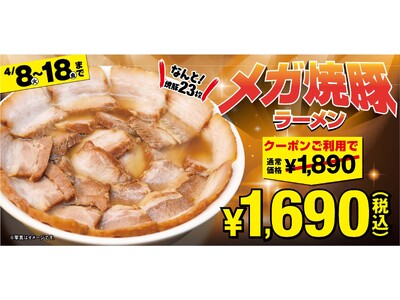 「喜多方ラーメン坂内」をはじめ国内外で多様なジャンルの飲食店事業を手掛ける株式会社麺食(本社:東京都品川区、代表取締役社長:中原 誠) は、「喜多方ラーメン坂内」全店にて、大人気企画『焼豚まみれ祭』を2025年4月8日(火)~4月18日(金)まで開催いたします。自慢のこだわりトロ旨焼豚を23枚豪快に盛りつけた特別メニュー「メガ盛り焼豚ラーメン」をお楽しみください。