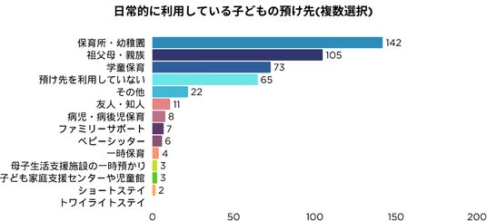 保育所・幼稚園(47.7%)、祖父母・親族(34.9%)、学童保育(24.5%)が多い一方、ファミリーサポートやベビーシッター、病児保育の利用は低いです。預け先を利用していない家庭は21.1%にのぼっています。