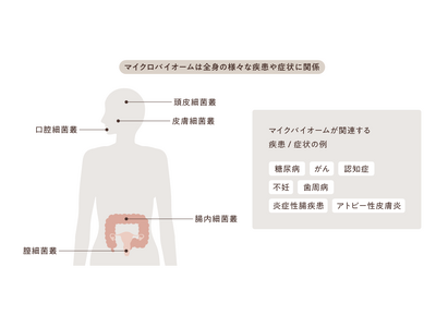 マイクロバイオームとは、腸内・皮膚・口腔内等のヒト身体の様々な部位に共生する微生物 (細菌・真菌・ウイルスなど)の総体を指します。 近年、マイクロバイオームが糖尿病、がん、認知症、不妊、歯周病、炎症性腸疾患、アトピー性皮膚炎等の様々な疾患や症状に関係していることが判明してきています。腸内マイクロバイオームが皮膚疾患に影響を及ぼす腸皮膚相関、口腔内環境が腸内マイクロバイオームの状態に影響を及ぼす口腸相関、腸内マイクロバイオームが自閉症や認知症などの疾患に影響を及ぼす腸脳相関など、全身のマイクロバイオームと疾患が複雑に関係しあっている点に特徴があり、ヒトのみならず動物においてもマイクロバイオームが健康に及ぼす影響が明らかになってきています。