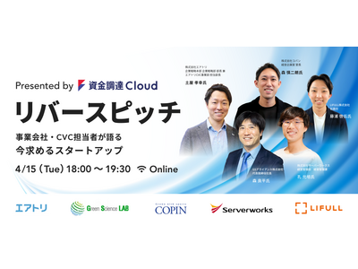 事業会社・CVCからの資金調達ができるマッチングプラットフォーム「資金調達クラウド」を運営する、株式会社M&Aクラウド(本社:東京都千代田区、代表取締役CEO:及川 厚博、以下「当社」)は、第2弾となるリバースピッチのウェビナーを4月15日(火)に開催します。「今求めるスタートアップ」をテーマに、積極出資企業5社からスタートアップへの出資、資本業務提携、新規事業創出等の戦略についてお話を伺います。
