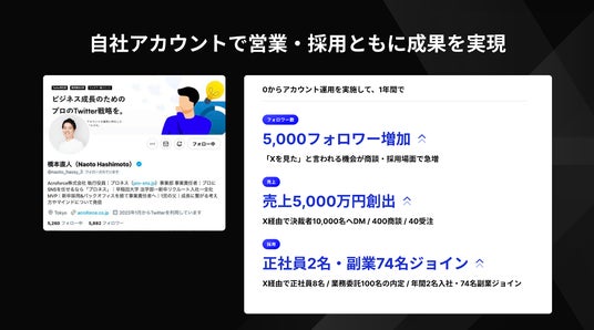結果、弊社取締役のアカウントを0から育てる中で1年で「フォロワー5000名」「売上5000万円」「業務委託含100名の内定」と、ビジネスインフルエンサーにならなかったとしてもXをビジネスに繋げるという成果を残すことができました。