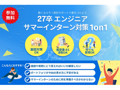 昨今、サマーインターンの重要性がますます高まっている中、エンジニア職を志望する学生の中には「何から始めていいか分からない」「ポートフォリオの作り方が不安」「面接の練習がしたい」という悩みを抱える方が多く存在します。本プログラムでは、そうした27卒のエンジニア学生の不安をすべて解消することを目指し、完全1on1での実践的かつ実用的な支援を行います。