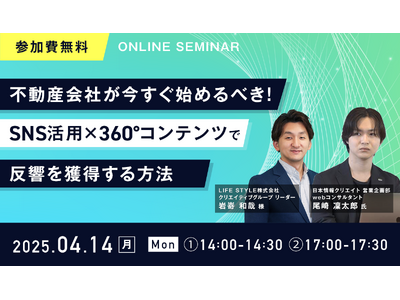 不動産テックを推進する日本情報クリエイト株式会社(本社:宮崎県都城市、代表取締役社長:辻村 都雄、証券コード:4054)は、2025年4月14日(月)に「不動産会社が今すぐ始めるべき! SNS活用×360°コンテンツで反響を獲得する方法」という無料オンラインセミナー(以下ウェビナー)を開催することを発表いたします。
