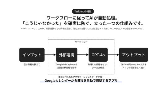 これまでのAIワークフローツールは複雑な操作が求められ、初心者にとって導入や継続的な利用が困難でした。Taskhubは専門知識がなくても直感的にAIを業務フローに取り入れられるよう設計されており、そのユーザビリティをより多くの方にいち早く体験していただくため、正式版に先立ちアーリーアクセス版の提供を決定いたしました。
