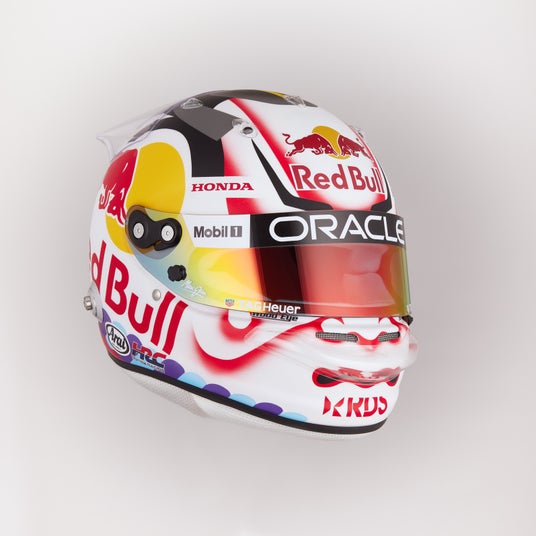 歌舞伎役者でF1日本GPの公式アンバサダーを務める市川團十郎さんがデザイン監修。市川團十郎家に代々伝わる家の芸、歌舞伎十八番の内『暫(しばらく)』をモチーフに、隈取や仁王襷をあしらったデザインとなっており、後頭部には市川團十郎直筆のカーナンバー「22」が描かれています。正面の口元にはRDSのロゴも描かれています。