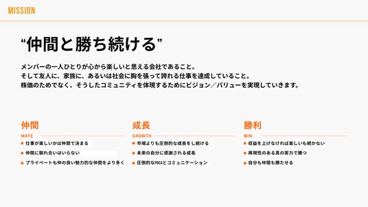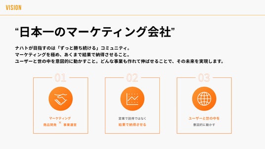 そこで、MISSIONを「仲間と勝ち続ける」、VISIONを「日本一のマーケティング会社」、VALUEを「変化適応と開拓」といった、ナハトが大切にする本質の想いを捉えつつ難しいメッセージ性を削ぎ落としたシンプルな言葉へとアップデートすることに至りました。