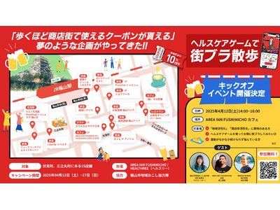 このたび、ヘルスケアゲーム「HEALTHREE(ヘルスリー)」を運営する株式会社HEALTHREE(所在地:東京都渋谷区、代表取締役CEO:山本 真也 / 田中 厳貴、読み:ヘルスリー)は、まち全体をひとつの「宿」と見立てた「まちやど」事業を展開する「AREA INN FUSHIMICHO」(運営会社:株式会社フューレック、所在地:広島県福山市)とのコラボレーションにより、広島県福山駅周辺(伏見町・三之丸町)の15店舗の協力のもと歩いてクーポンが貰える「ヘルスケアゲームで街ブラ散歩」キャンペーンを開催します。