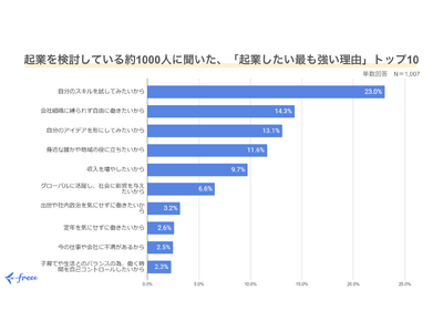 フリー株式会社(本社:東京都品川区、CEO:佐々木大輔)が発行する起業・開業の専門雑誌『起業時代』が、全国の起業を検討している18歳~59歳の1,007人を対象に「起業をしたい理由」に関する調査を実施しました。