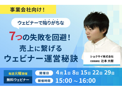 ショクサイ株式会社(代表取締役:辻本 大樹)は4月1日(火)15時よりBtoBマーケティング担当者向けに「事業会社向け!ウェビナーで陥りがちな7つ失敗を回避!売上に繋げるウェビナー運営秘訣」を開催いたします。
