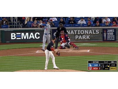 日本時間4月8日午前に行われたナショナルズ対ドジャース戦(ナショナルズ・パーク)の3回表、ドジャースの大谷翔平選手が4試合ぶりの4号ホームランを放ちましたが、試合中継では打席に立つ大谷選手の後方に、当社(BEMAC株式会社)の「BEMAC」ロゴが掲示されました=写真=。