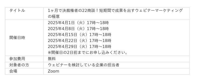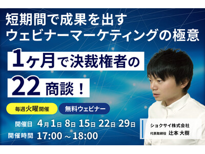 ショクサイ株式会社(代表取締役:辻本 大樹)は4月1日(火)17時よりBtoBマーケティング担当者向けに「1ヶ月で決裁権者の22商談!短期間で成果を出すウェビナーマーケティングの極意」を開催いたします。