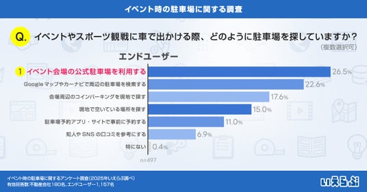 「イベントやスポーツ観戦に車で出かける際、どのように駐車場を探していますか?」という質問をしたところ、「イベント会場の公式駐車場を利用する」と回答が26.5%で最多となり、次いで「Googleマップやカーナビで周辺の駐車場を検索する」(22.6%)、「会場周辺のコインパーキングを現地で探す」(17.6%)となっています。