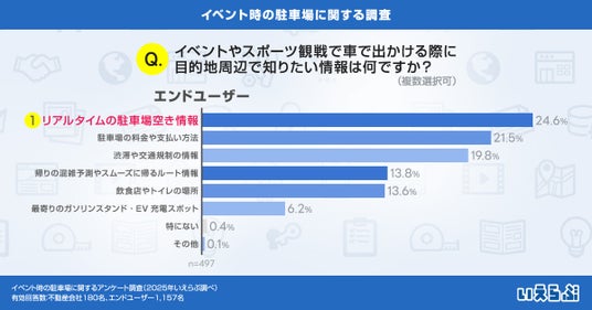 「イベントやスポーツ観戦で車で出かける際に、目的地周辺で知りたい情報は何ですか?」という質問をしたところ、「リアルタイムの駐車場空き情報」(24.6%)が最も多く、次いで「駐車場料金や支払い方法」(21.5%)、「渋滞や交通規制の情報」(19.8%)となりました。