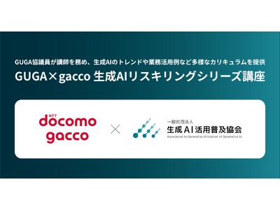 生成AIを社会に実装し、産業の再構築を目指す一般社団法人生成AI活用普及協会(理事長:井畑 敏、所在地:東京都港区、以下:GUGA)は、株式会社ドコモgacco(代表取締役CEO:佐々木 基弘、所在地:東京都港区、以下:ドコモgacco)が運営する国内最大級のオンライン動画学習サービス「gacco」において、「GUGA×gacco 生成AIリスキリングシリーズ講座」を開講することをお知らせいたします。また、本講座の導入編として、生成AIリスキリングの基本や生成AI活用のリアルをテーマにした特別共催ウェビナーを2025年4月21日(月)に開催いたします。