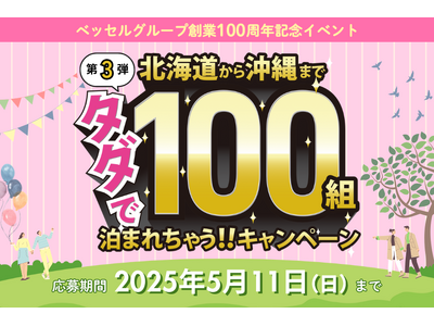 「あなたと家族と街を愛する。」をビジョンに、全国でホテル事業を展開する株式会社ベッセルホテル開発(本社:広島県福山市南本庄三丁目4番27号、代表取締役社長:瀬尾 吉郎(せお よしろう)、以下ベッセルホテルズ)は、ベッセルホテルズのグループ会社である株式会社ベッセル(本社:広島県福山市南本庄三丁目4番27号、代表取締役社長:菅田 卓志(すがた たくし)が2024年10月1日に創業100周年を迎えたことを記念し、ベッセルホテルズの公式InstagramとXにおいて、全国35店舗で利用できる無料宿泊クーポンが100組にあたるキャンペーンの第3弾を同時開催します。2024年11月に応募した第1弾が応募総数14,000件を超え、2025年1月に応募した第2弾のキャンペーンでは、第1弾を超える16,000件以上のご応募をいただきました。
