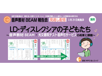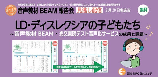 ディスレクシア当事者支援団体の認定NPO法人エッジ(東京都港区 会長藤堂栄子)は「音声教材BEAM・光文書院テスト音声化サービスの成果と課題」報告会(3月29日開催)の見逃し配信を公開します。