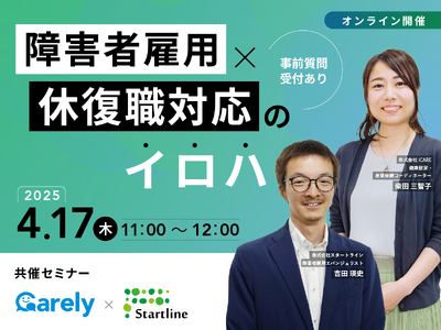 障害者就業支援を通じて“誰もが自分らしく生きる社会”を目指す株式会社スタートライン(本社:東京都三鷹市、代表取締役:西村賢治)は、「働くひとの健康を世界中に創る」というパーパスを掲げる株式会社iCARE(本社:東京都品川区、代表取締役CEO:山田洋太、以下iCARE)と、『障害者雇用×休復職対応のイロハ』のウェブセミナーを共催します。