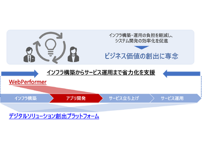 今回の「デジタルソリューション創出プラットフォーム」との連携により、システムの稼働環境に関する負担は「デジタルソリューション創出プラットフォーム」が担い、個別の業務要件に合わせたアプリケーション開発は「WebPerformer」が支援することにより、より高速なシステム開発とインフラ構築/運用の負担軽減を実現できます。