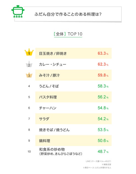 全体では「目玉焼き/卵焼き」「カレー・シチュー」が6割強でTOP2となりました。上位には「みそ汁/豚汁」「鍋料理」といった汁物系、「うどん/そば」「パスタ料理」「焼きそば/焼うどん」「チャーハン」などの麺・主食系、「サラダ」「和食系の炒め物(野菜炒め、きんぴらごぼうなど)」といった副菜まで幅広くランクインしており、和洋中さまざまなジャンルの料理が作られているようです。