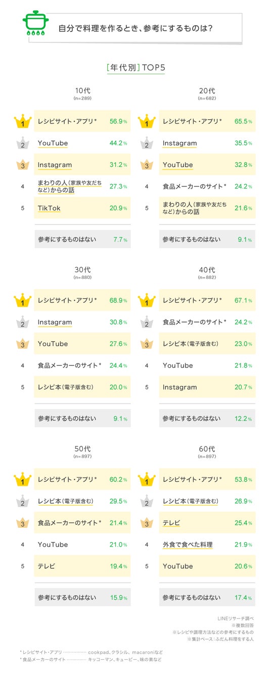 全体では「レシピサイト・アプリ」が6割強で1位。2位以降は「YouTube」「レシピ本(電子版含む)」「食品メーカーのサイト」「Instagram」「まわりの人(家族や友だちなど)からの話」が続きました。