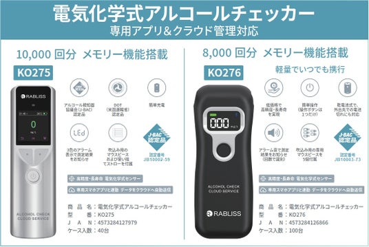 専用アプリ&クラウド管理に対応した、電気化学式アルコールチェッカーKO275,KO276もお取扱中です。(どちらもアルコール検知器協議会 認定機器です。)