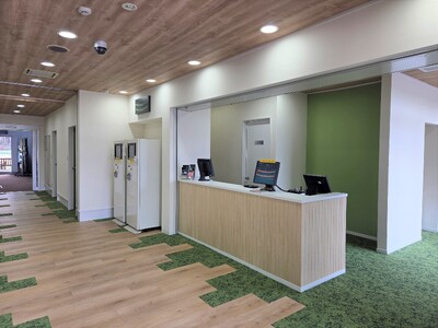 今回のリニューアルでは、クラブハウスを全面改装し、緑を基調とした開放的な館内が、癒しの空間 “オアシス” となり、お客さまが心身ともにリフレッシュできるひとときをお過ごしいただけるようになりました。着替えが必要なお客さま向けに更衣室を新設し、特に女性更衣室には日焼け止めやヘアケア用品などのアメニティを設置しました。