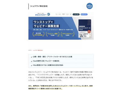ショクサイ株式会社(本社:大阪府、代表取締役:辻本 大樹)が提供する「まるごとウェビナー」が、「比較ビズ」内のコラムにて紹介していただきました。企画からアフターフォローまですべてをまるっと支援します。
