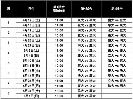 リーグ戦は6校総当たり形式で、同じカードをどちらかが「2勝」するまで戦い、2勝したチームに「勝ち点1」が与えられます。最終的に勝ち点の数によって順位が決定されます。