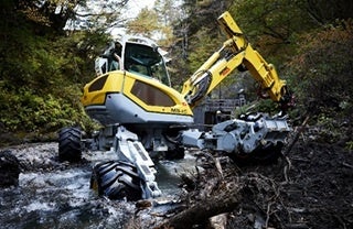 現場、用途に応じて、掘削バケット、グラップル、ハーベスタ、削孔ドリル、杭打ちハンマー、マルチャーなど様々なアタッチメントを取り付けできることもできるため、土木、林業、河川・護岸、災害復旧など、広範な用途に対応します。災害時には、トラック輸送で到達できなかった場所にいち早く、自走で到達することができる高性能重機です。