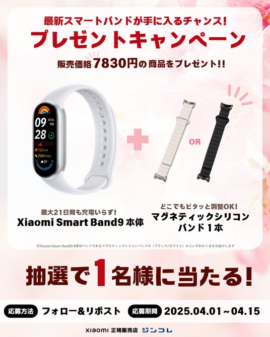 Apple Watchバンドやスマートフォンアクセサリーを販売するJIN株式会社(東京都中央区)は、ジンコレ公式Xでプレゼントキャンペーンを開催中です。世界的に人気のウェアラブルデバイスXiaomi Smart Band 9本体&ジンコレバンドのセットを、公式Xをフォロー・リポストしていただいた方の中から抽選で1名様にプレゼントします。本リリースでは、プレゼントのバンドと、Xiaomi Smart Band 9本体でできることについてご紹介します。