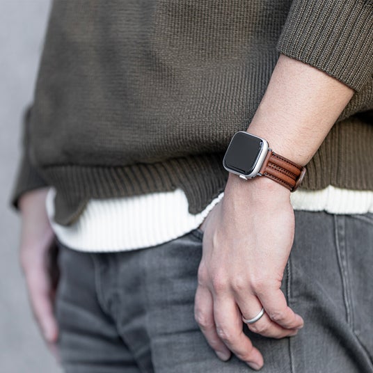 ナチュラルな印象のブラウンは、カジュアルにもつけられて普段使いしやすいカラー。レザーバンドは、ラフな服の日もコーディネートをグッと引き締めてくれます。
