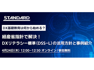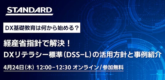 大手企業を中心に1,000社以上のデジタルトランスフォーメーション(以下、DX)の推進と内製化を支援する株式会社STANDARD(本社:東京都港区、代表取締役社長:伊藤 海)は、4月24日(木)12時より、Webセミナー『DX基礎教育は何から始める?経産省指針で解決!DXリテラシー標準(DSS-L)の活用方針と事例紹介』を開催いたします。