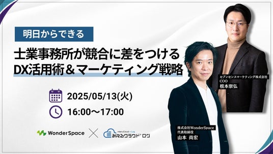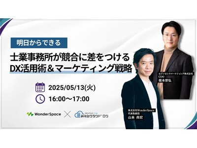 株式会社WonderSpace(本社:東京都港区、代表取締役社長:山本 尚宏)は、セブンセンスマーケティング株式会社(本社:静岡県沼津市、代表取締役:宮田 昌輝)と『【プロが教える!】士業事務所が競合に差をつけるDX活用術&マーケティング戦略』をテーマに共催ウェビナーを開催します。
