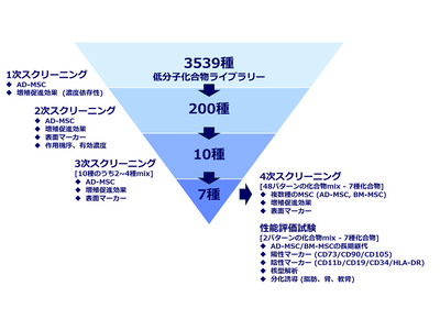 本共同開発では、マイオリッジにおける培地スクリーニングの手法を活用し、独自に設計した低分子化合物ライブラリーから候補化合物を選定し、新規MSC用培地として有用な化合物及び組み合わせを探索した結果、MSCの培養に適した化合物mixを見出しました。