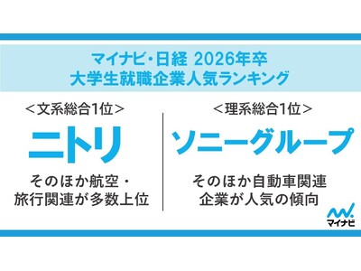 株式会社マイナビ(本社:東京都千代田区、代表取締役 社長執行役員:土屋芳明)は、株式会社 日本経済新聞社(本社:東京都千代田区、代表取締役社長:長谷部剛)と共同で、2026年卒学生を対象とした「マイナビ・日経 2026年卒大学生就職企業人気ランキング」を実施し、文系ランキング(総合・男子・女子)と理系ランキング(総合・男子・女子)の各上位100社を発表します。