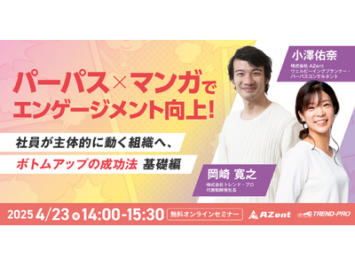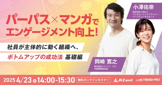 「従業員一人ひとりのはたらく幸せと業績向上の両立」を目指すHRサービス「Well-being HR」を提供し、ウェルビーイング経営の伴走型導入支援を行う株式会社AZent(本社:東京都港区、代表取締役CEO:柳沼圭佑、以下AZent)は、株式会社トレンド・プロ(本社:東京都港区、代表取締役社長:岡崎寛之、以下トレンド・プロ)と共同で、パーパス(理念)を分かりやすく浸透させる手法として注目される「マンガ」を活用し、従業員エンゲージメントを高める成功法を解説するウェビナーを2025年4月23日(水)14時より開催いたします。
