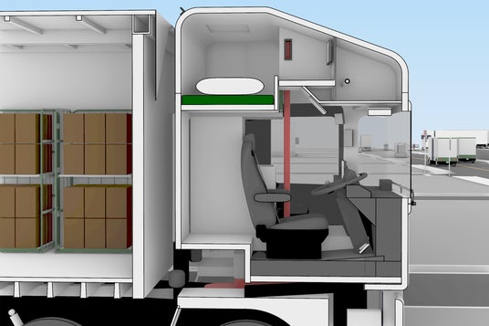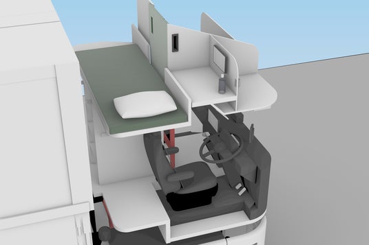 本日公開したトラックでは、より快適に休息をとることができるよう、休息用個室をキャビン後部に設けています。この個室は車体に固定され、且つ壁に囲まれており、走行中にも仮眠可能な空間を確保します。また、個室に上がるためのはしごは常時使用可能となっているため、有事の際にも速やかに脱出が可能です。