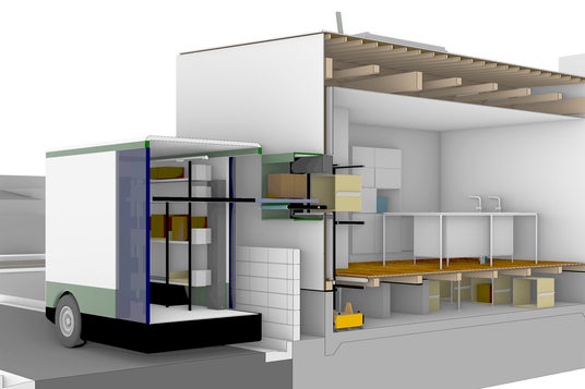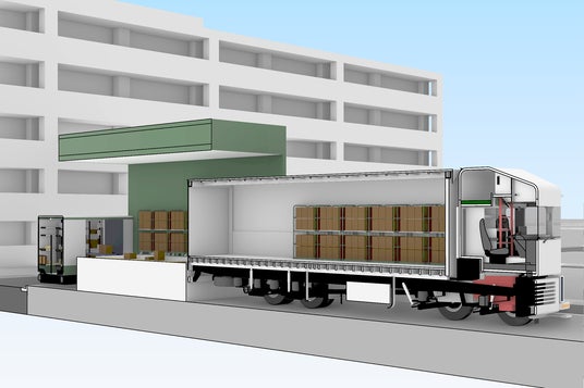建築現場などで一定期間使用する倉庫に、移動機能がつくイメージです。他の配送ツールとしての車両とは異なり、主の機能は倉庫であり、走行機能は副次的なものとなります。