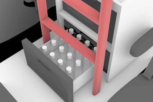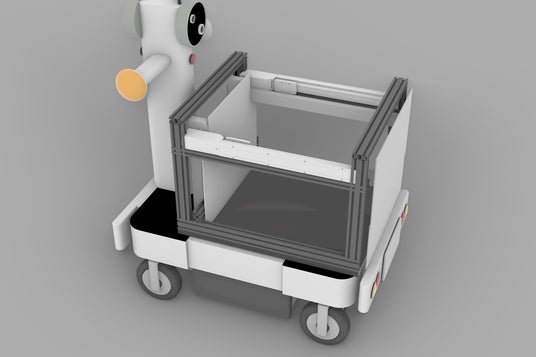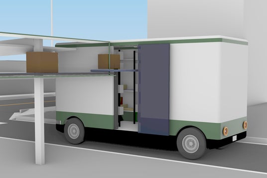 一般的な2トントラックの荷台部分に自動配送機構を搭載した配送車両です。