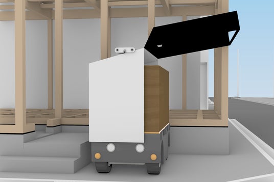 そのため、現場付近まではトラック(A5+90 Type004)などに積載されて移動します。主な搭載物はサブロク板(合板910mm×1,820mm)を想定しています。移動倉庫カテゴリーの車両は、安価な自動運転を採用することがポイントです。これを実現するためのハードウェア構成とともに、運用に関する技術も無償提供の対象となります。