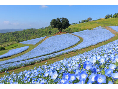 メインエリアの「花の谷」では、今週末から見頃に入り、ゴールデンウィークに満開を迎え、5月上旬までお楽しみいただける見込みです。100万本のネモフィラが一面を爽やかな青に彩る圧巻の花畑をぜひお楽しみに。