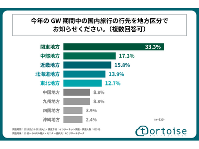 次に、「今年のGW期間中の国内旅行の行先」を問う設問への回答で最も多かったのは、1位が「関東地方」で33.3%、次いで2位が「中部地方」で17.3%、3位が「近畿地方」で15.8%という結果になりました。この結果から、東名阪という大都市圏周辺への旅行を予定している人が多いことが判明しました。