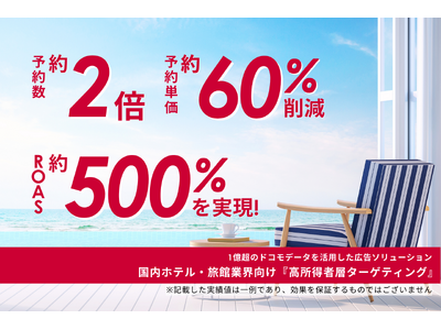 また、今回のリリースに先立ち、docomo Ad Network(※2)のメール型広告「メッセージS」で本「高所得者層ターゲティング」を使用し、宿泊予約サイトを商材とした広告配信を実施いたしました。その結果、他セグメントの実績平均と比較して、オンライン予約数は約2倍、予約単価は約60%削減、また広告の費用対効果を示すROASは約500%と、獲得効率だけでなく費用対効果においても高い成果を実現しました。