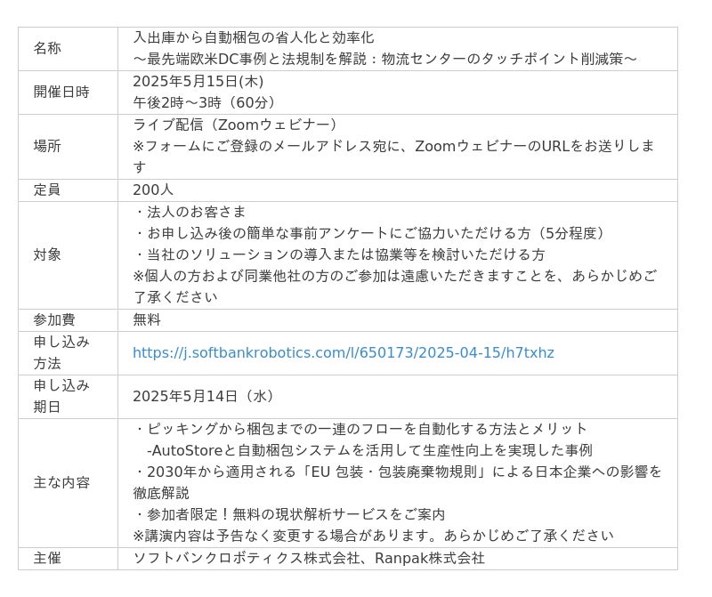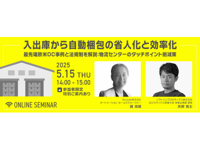 ソフトバンクロボティクス株式会社(本社:東京都港区、代表取締役社長 兼 CEO:冨澤 文秀)は、Ranpak株式会社(本社:横浜市、代表取締役:ヴィンセント・ウィリアム・シェモ、以下「Ranpak」)と法人向けオンラインセミナー「入出庫から自動梱包の省人化と効率化」を2025年5月15日(木)に共催します。また、セミナーに参加された企業の中から抽選で1社に、「現状解析サービス」を無料で提供します。