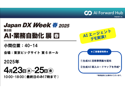 イマジエイト株式会社(本社:東京都渋谷区、代表取締役:津田 幸佑)は、2025年4月23日(水)~25日(金)に東京ビッグサイトで開催される「Japan IT Week 春 2025 第8回 AI・業務自動化展」に「AIフォワードハブ」を出展いたします。