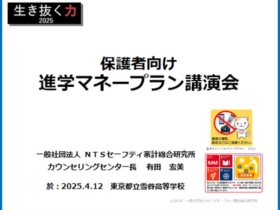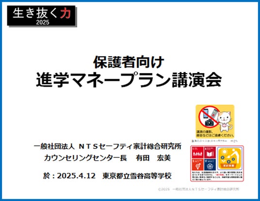 4月12日(土)、一般社団法人NTSセーフティ家計総合研究所(東京都港区)は、東京都立雪谷高等学校(東京都大田区)3年生の保護者の皆様を対象に、高等教育機関進学に必要なお金と、そのための準備として、マネープランの立て方、利用できる進学資金などについて、お話させていただきました。