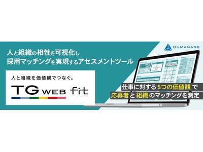 人材の“採用”から“定着”、その先の“活躍”までを支援する人材サービス事業を展開する株式会社ヒューマネージ(本社:東京都千代田区、代表取締役社長:齋藤 亮三)は、仕事に対する“5つの価値観”で人と組織の採用マッチングを実現するアセスメントツール『TG-WEB fit』(ティージーウェブ フィット)のリリースを発表した。