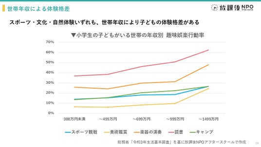 総務省の「令和3年生活基本調査」によると、世帯年収が高い家庭ほど、子どもの体験活動が充実しているとの結果が出ており、家庭の経済状況による体験の格差が生まれていることが示唆されます。