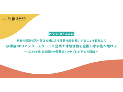 「日本中の放課後を、ゴールデンタイムに。」をミッションに活動する 特定非営利活動法人 放課後NPOアフタースクール(代表理事:平岩国泰、本部:東京都文京区/以下「放課後NPOアフタースクール」)は、家庭の経済状況や居住地域に関係なく、すべての子どもたちが体験機会を得られる社会を目指して活動を続ける中、2025年度もパートナー企業と協働して、日本全国の小学生の居場所に体験活動を届けます。7つの企業協働プログラムにおいて、実施団体の募集を行っています。