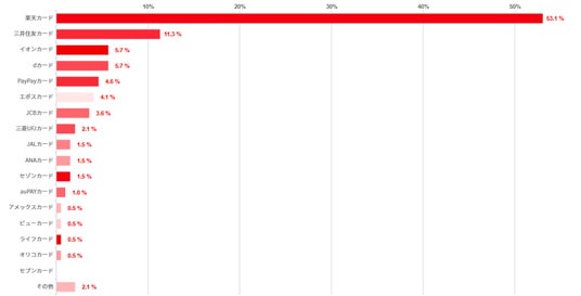 楽天カードが53.1%で過半数を超えて圧倒的に多かった。なお、それ以外は三井住友カードが11.3%、イオンカードとdカードが5.7%などで票を集めた。